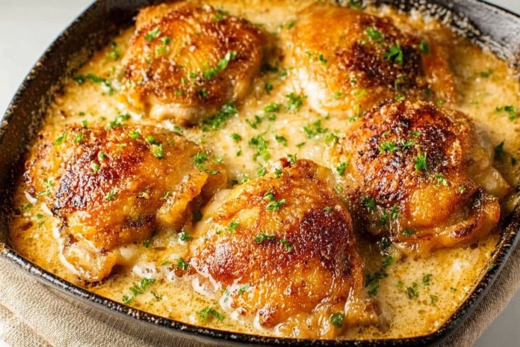 Creamy One Skillet Smothered Chicken Thighs